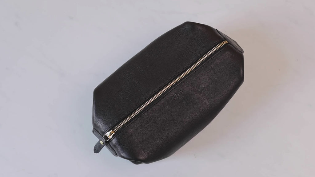 Journey confidently with our Modern Collection Dopp Kit, a blend of timeless style and lasting quality. Crafted with USA-made sustainable leather, this unisex toiletry bag doubles as an unforgettable groomsman gift. Personalize it with up to three chracters for a unique touch, opt to add foil for an extra pop. Fully lined for a smooth finish, features durable and eye-catching brass hardware, high quality YKK brass zipper for a smooth and dependable zip, precise decorative stitching, and edgepainted because we know every detail is important. Modern Collection Dopp Kit Dimensions 9" x 5" x 4".
