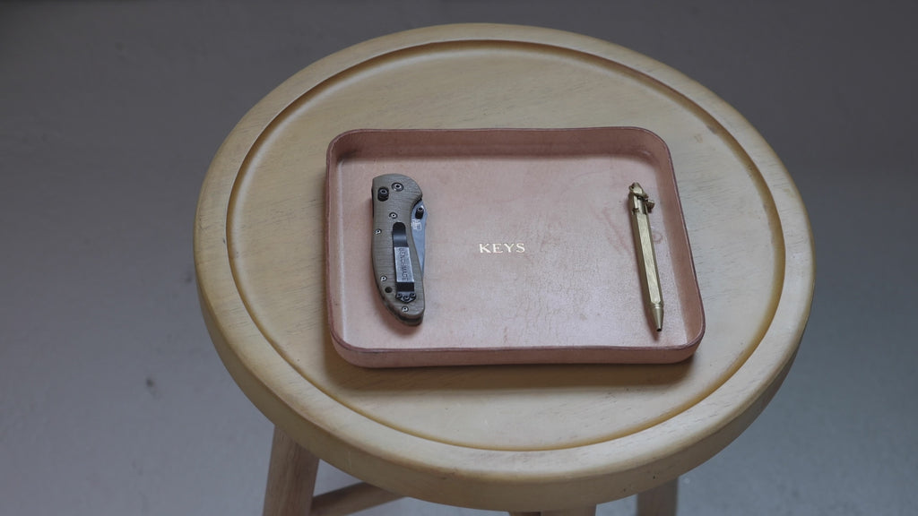 Get your organizational game on with this super cool, USA-made, sustainable leather storage tray! It's the perfect spot for all your bits and bobs, whether it's on your desk, by the front door, or keeping your bling in line. This awesome minimalist tray is made from one solid piece of vegetable-tanned leather, and you can grab it in two shapes. Make it totally yours by personalizing it with up to ten characters, and add some sparkly foil for an extra pop! Dimensions: Rectangular 9.25” x 7.75” x 0.875”, Round 7.5” in Diameter x 0.75”